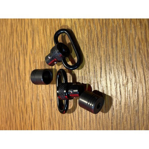 Abnehmbare Riemenbügel mit Druckknopf. Für 25,4mm / 1" Gewehrriemen. Lieferumfang 2 Stück mit zwei Buchsen. Die Halter werden vorzugsweise in den Schaft eingelassen und angeschraubt (Schrauben nicht dabei) durch Eindrücken eines Knopfes löst sich die Kugelarretierung der Riemenbügel. Schnelles Auf- und Abnehmen . Material; Stahl